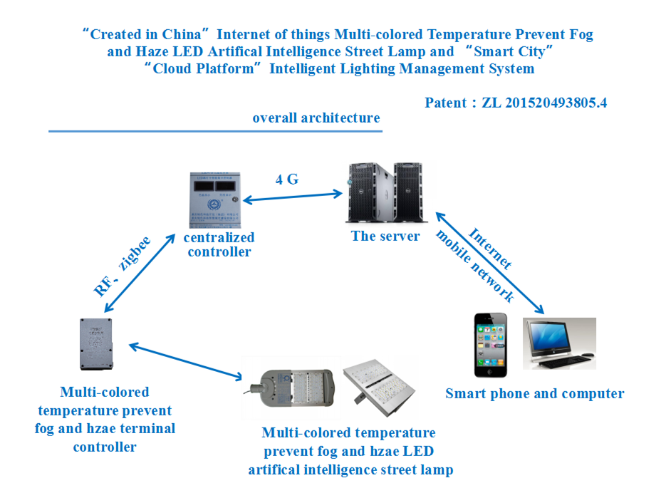 The mainly hardware of “smart city” “cloud platform” intelligent lighting management system is including the “intelligent centralized controller” “intelligent terminal prevent fog and haze, brightness adjustable controller” “multi-colored temperature prevent fog and haze, brightness intelligent remote regulating  LED artificial intelligent street lamp”, etc. Includes time, preset, automatic remote control and other control mode. On the basis of ordinary monochromatic LED street lamp, using the Internet, 4G mobile communication, wireless communication technology, remote wireless intelligent control system, by the server for centralized controller issued a command, centralized controller logarithmic kilometers inside each terminal controller to interconnect each other, to achieve every single light color temperature, brightness remote setting, prevent fog and haze, remote monitoring and alarm, etc. At the same time, it can collect the datas such as PM 2.5, temperature, humidity, voltage, current, traffic, anti-theft image and video automatically, provide this public data information for meteorology, traffic, security and other departments and have smart car charging and electricity billing capabilities.