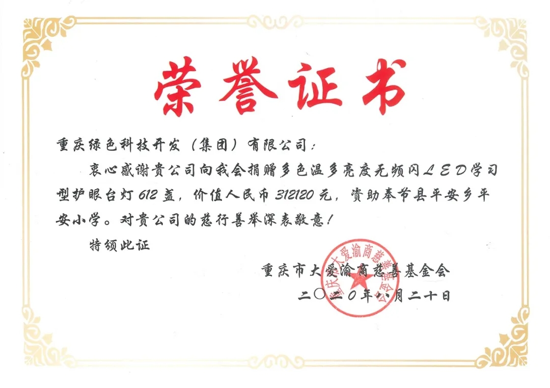 2020年8月5日,重慶綠色科技開發(fā)(集團(tuán))有限公司支持國家級(jí)重點(diǎn)貧困縣精準(zhǔn)扶貧工作,通過重慶市大愛渝商慈善基金會(huì),向奉節(jié)縣平安鄉(xiāng)平安小學(xué)捐贈(zèng)多色溫多亮度無頻閃LED學(xué)習(xí)型護(hù)眼臺(tái)燈612盞、太陽能智慧燈桿4套,總價(jià)值36.2萬元的愛心物資,助力脫貧攻堅(jiān)。